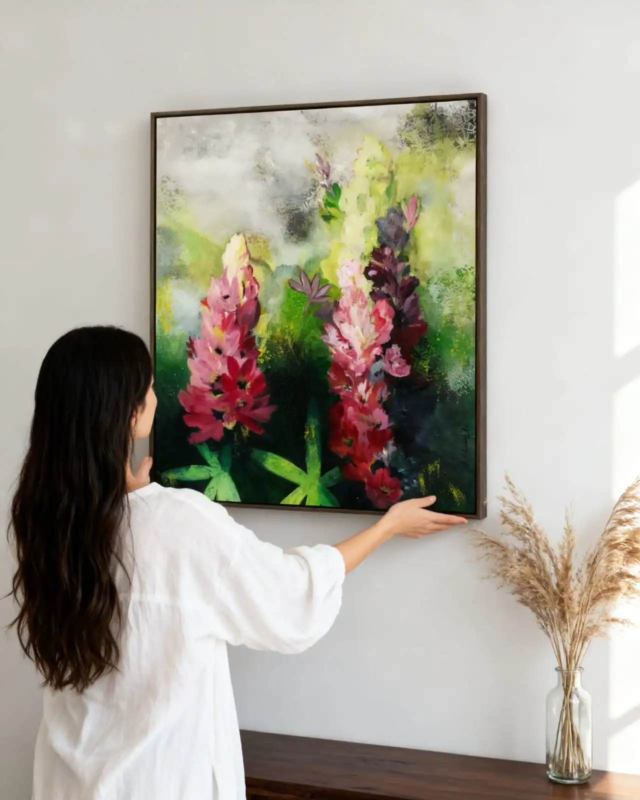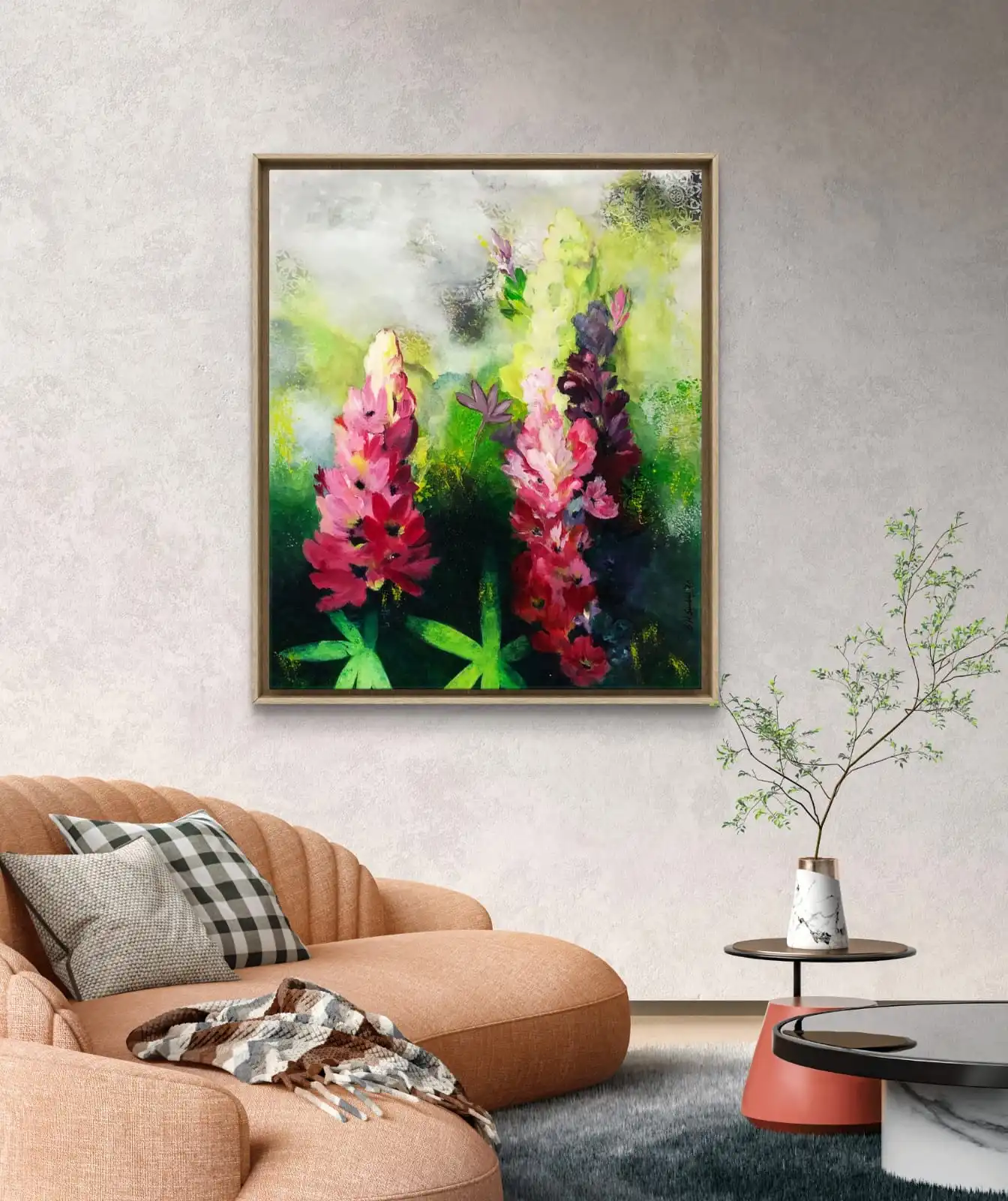 Bloom Together in Harmony is an original floral garden painting by artist Sabiha Hasan Sumbul. The painting shows soft pink flowers growing on upright stems. Fresh green leaves add balance to the scene. The colors feel calm and natural.