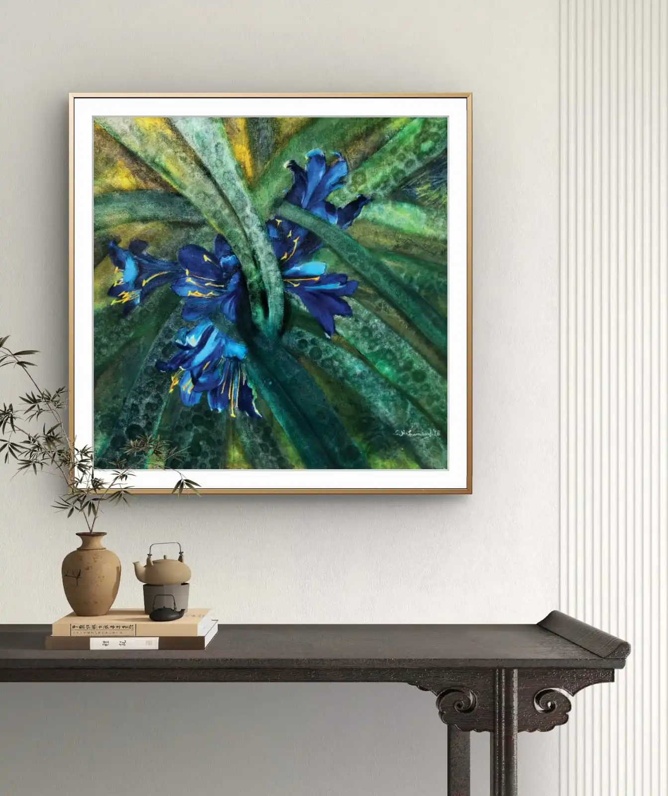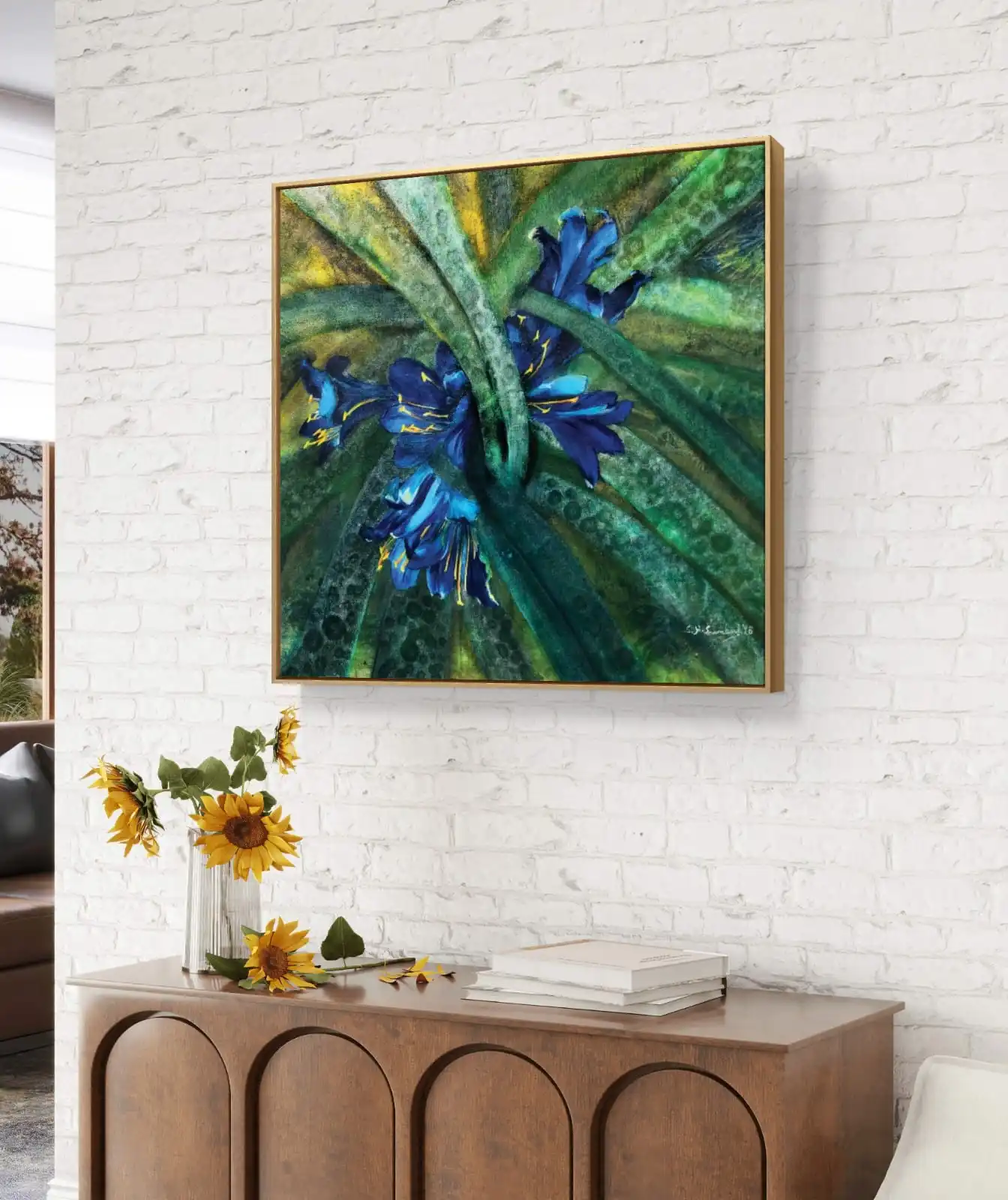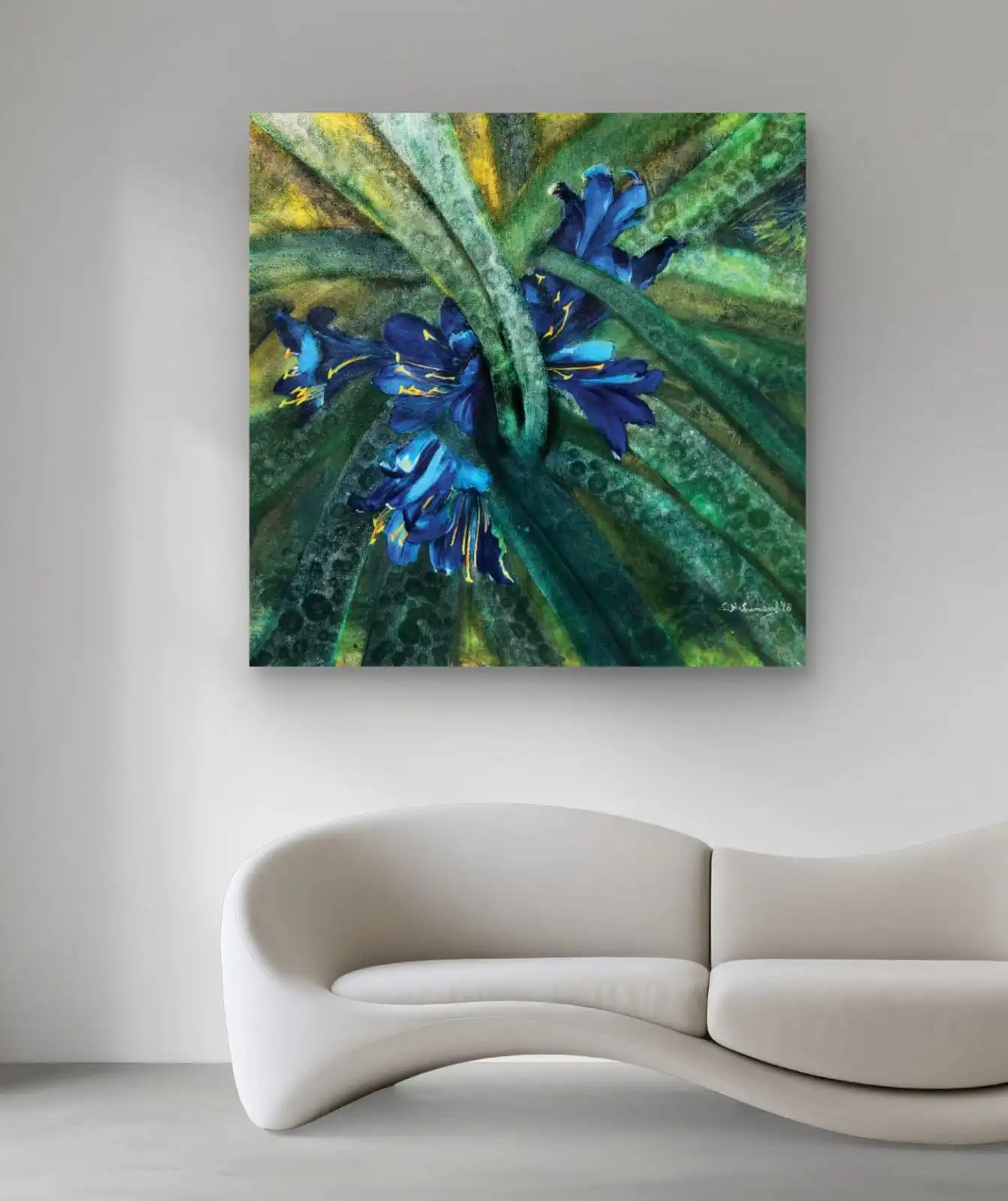 The canvas blends classic and modern styles. Soft blue and natural tones match many interiors, from modern to traditional. Every piece is original, signed by the artist, and fully copyright-protected. This makes it a lasting, unique work of art.