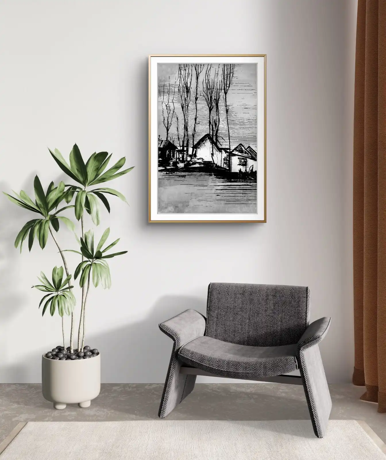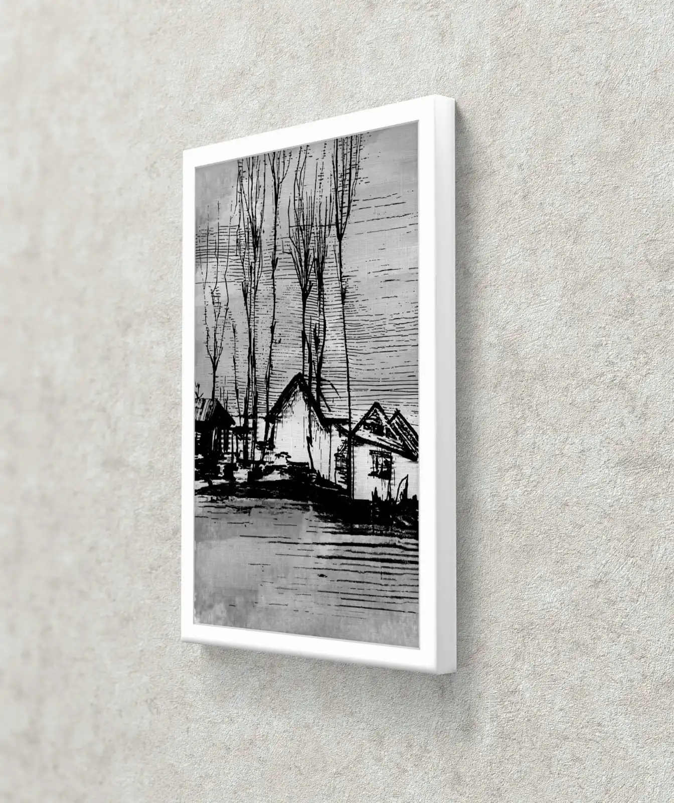 This Charcoal Village Landscape Sketch suits both modern and classic interiors. It works well in living rooms, studios, and offices.