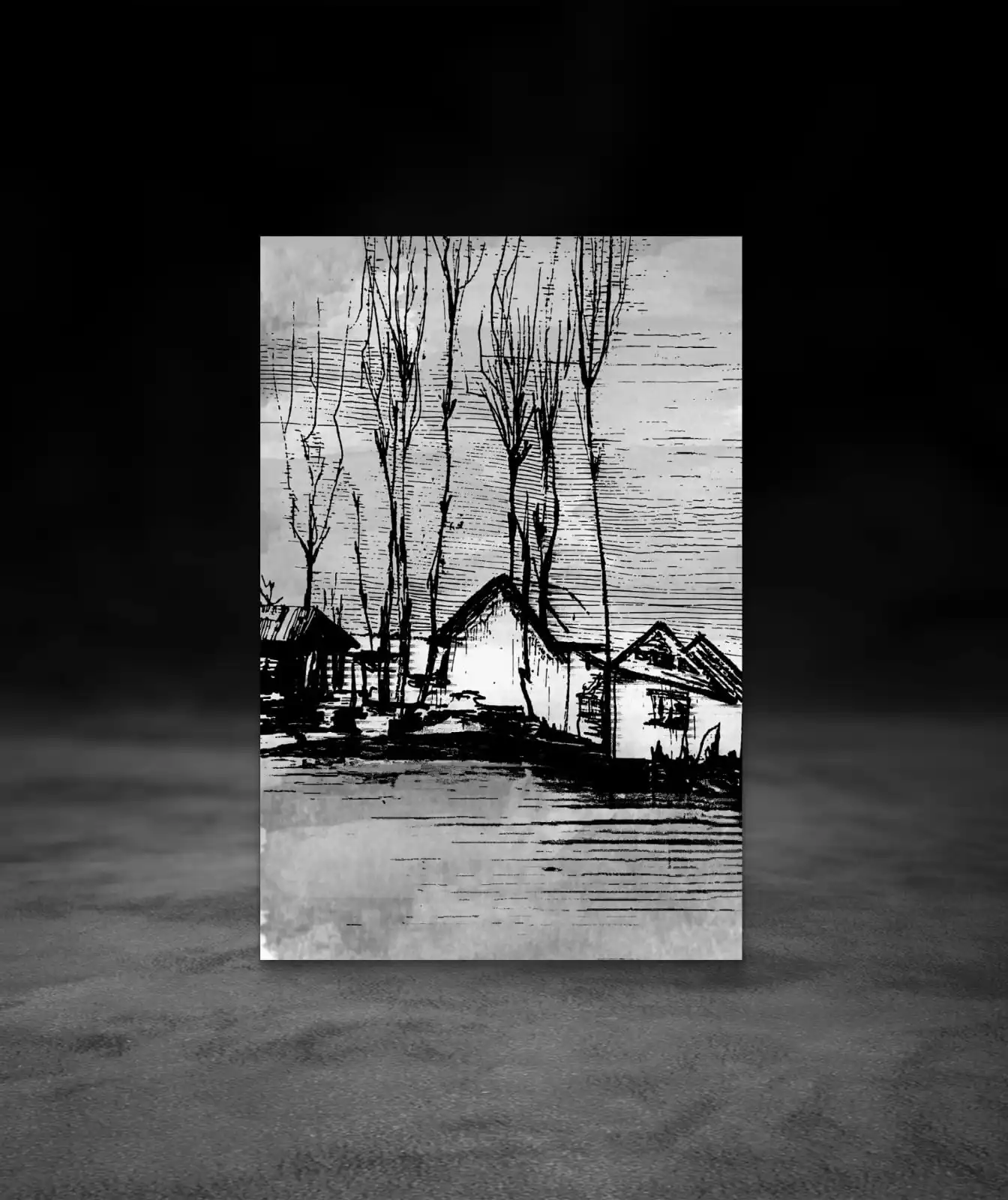The artwork shows a quiet village scene. Simple houses and bare trees create a calm mood. Clean lines and soft charcoal add depth and balance. The black and white tones feel timeless and peaceful.
