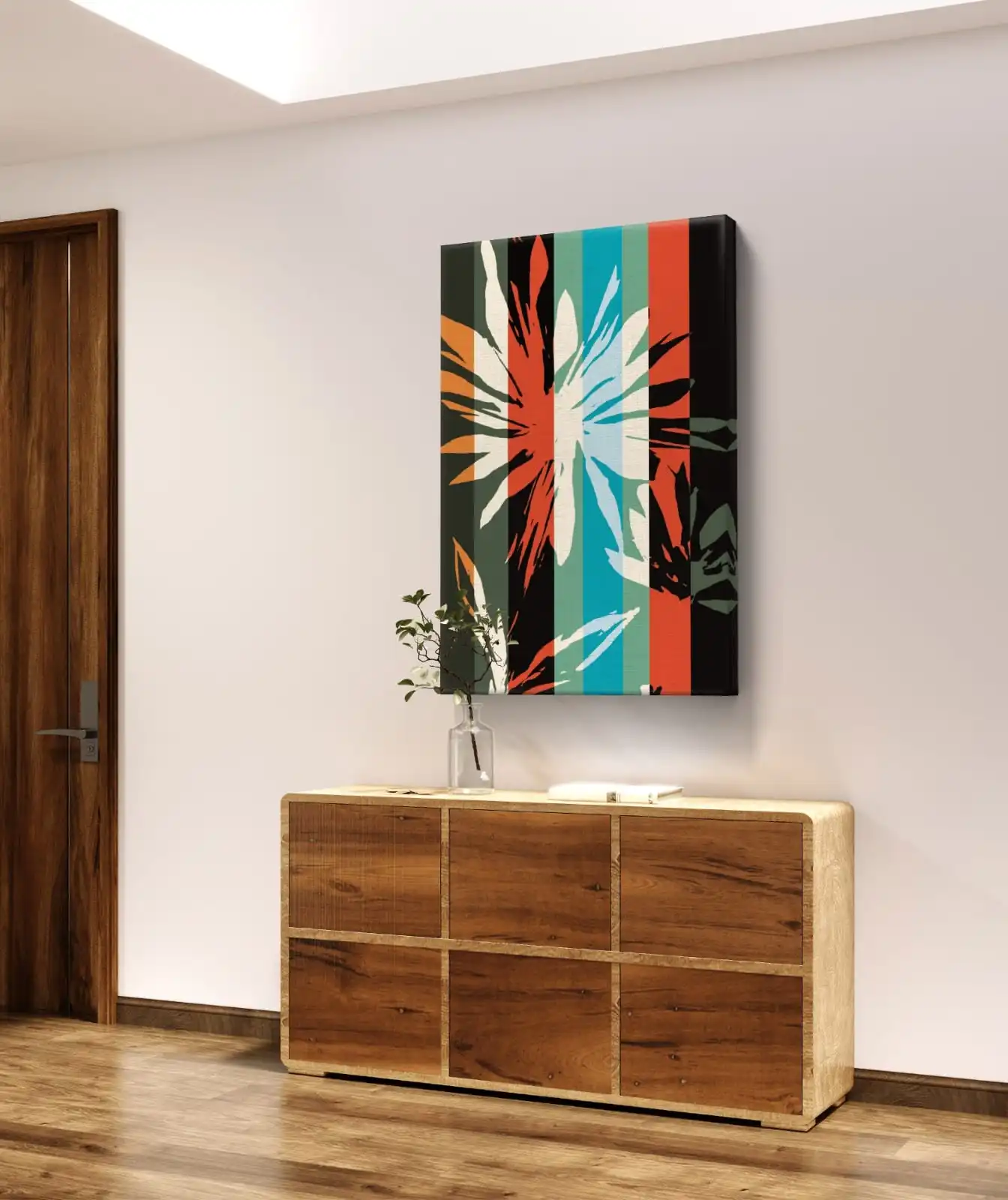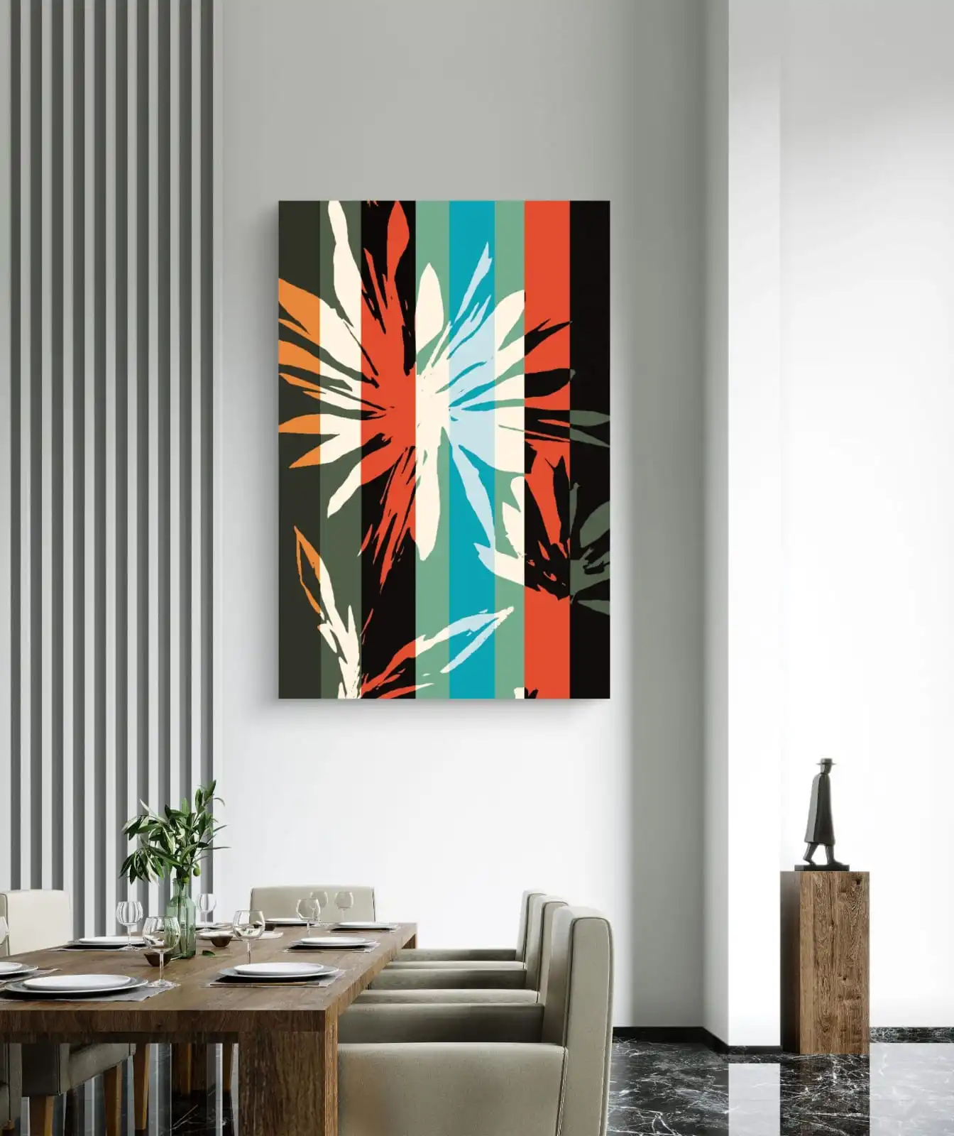 This artwork adds energy to any space. The design feels modern yet playful. It works well in living rooms, bedrooms, offices, or creative studios. The striped background enhances depth and makes the floral shape stand out.
