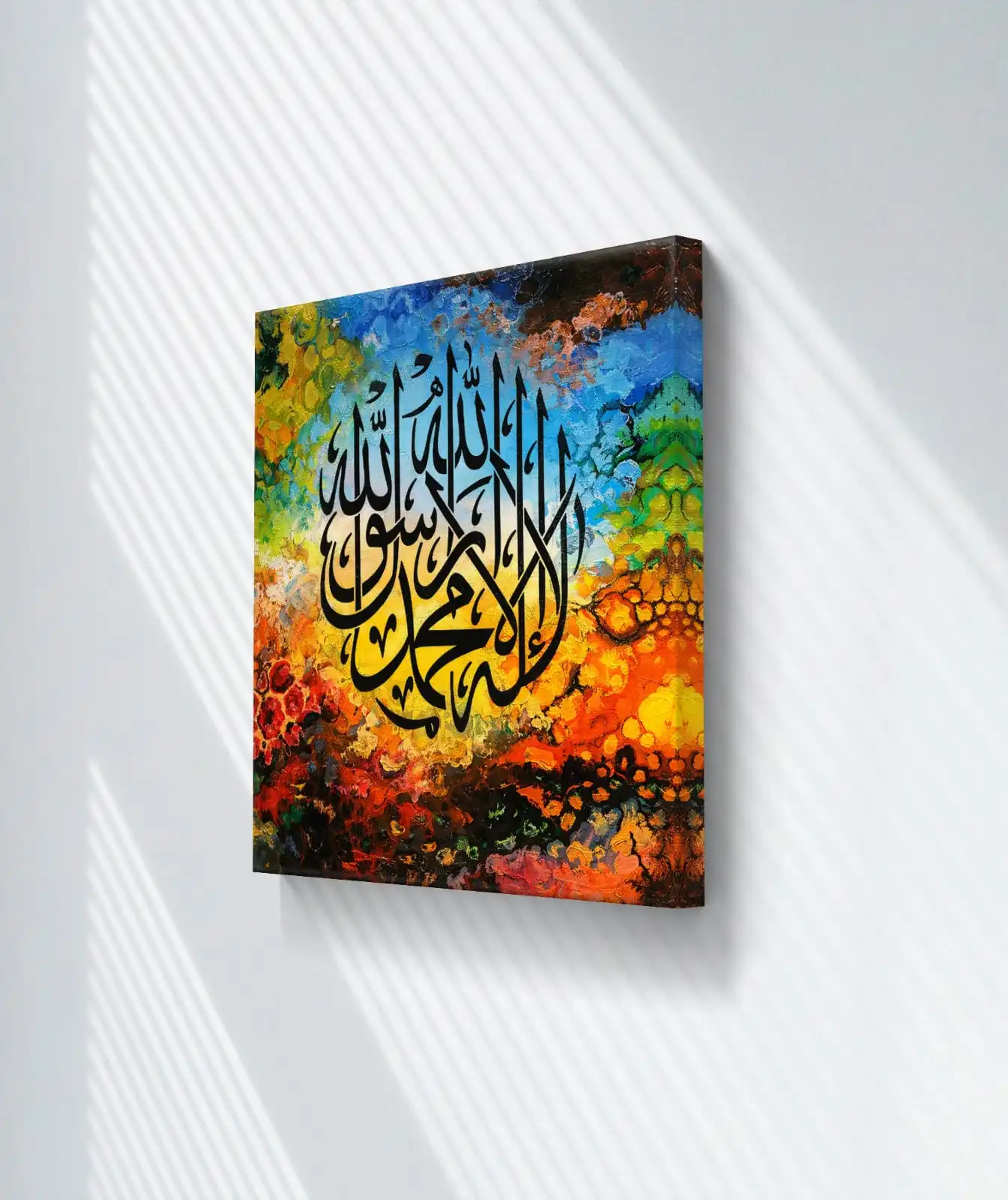 This artwork features Divine Oneness Calligraphy Art on a soft abstract background. The surface shows gentle movement through layered colors. Each color blends smoothly into the next. The calligraphy sits clearly at the center. It feels calm and steady.