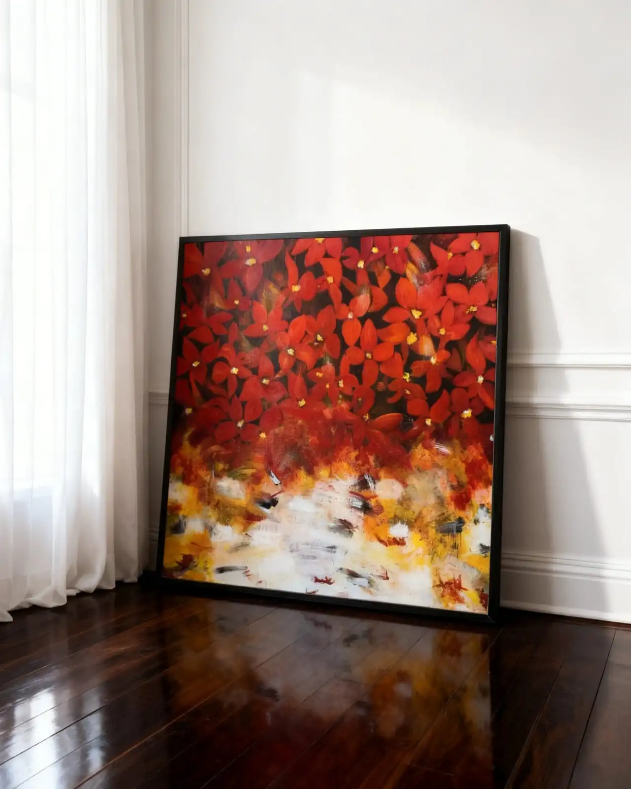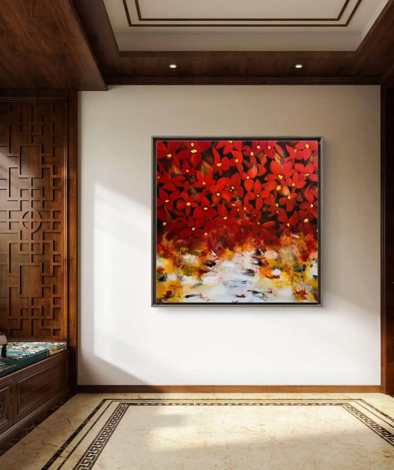 Effort Blossoms into Glory is an original floral painting by artist Sabiha Hasan Sumbul. The painting shows bright red flowers full of life. The blooms rise with strong energy. The colors feel bold and warm. The artwork reflects growth and success.