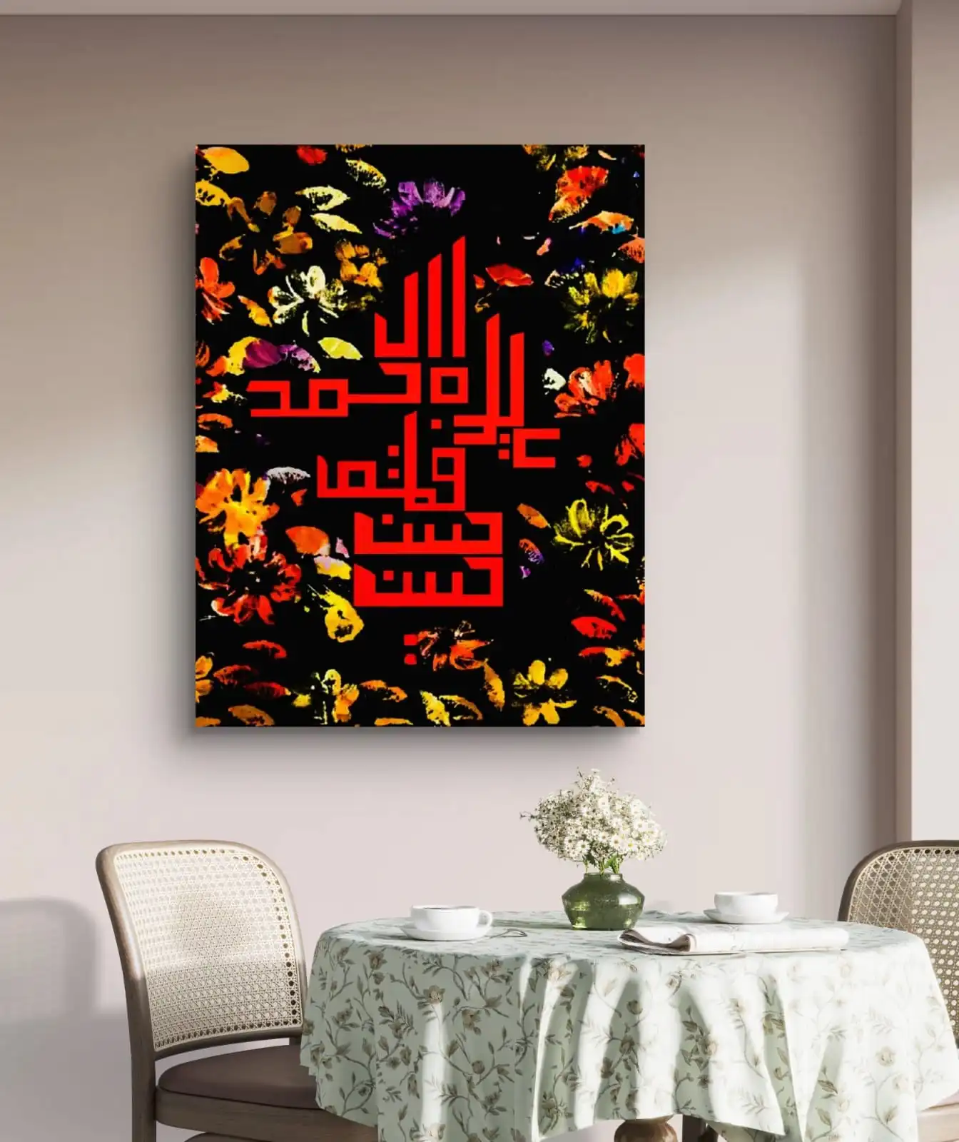 Eternal Five in Bloom is a calm calligraphy artwork with a soft floral background. The script flows with ease. The flowers add gentle beauty and balance.