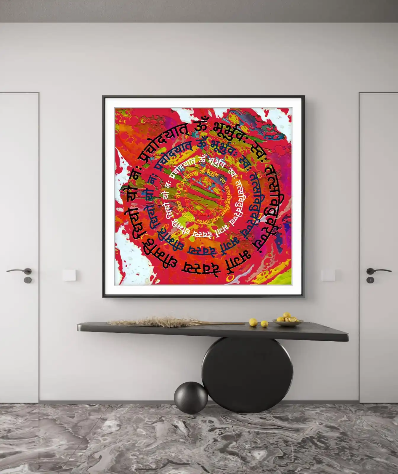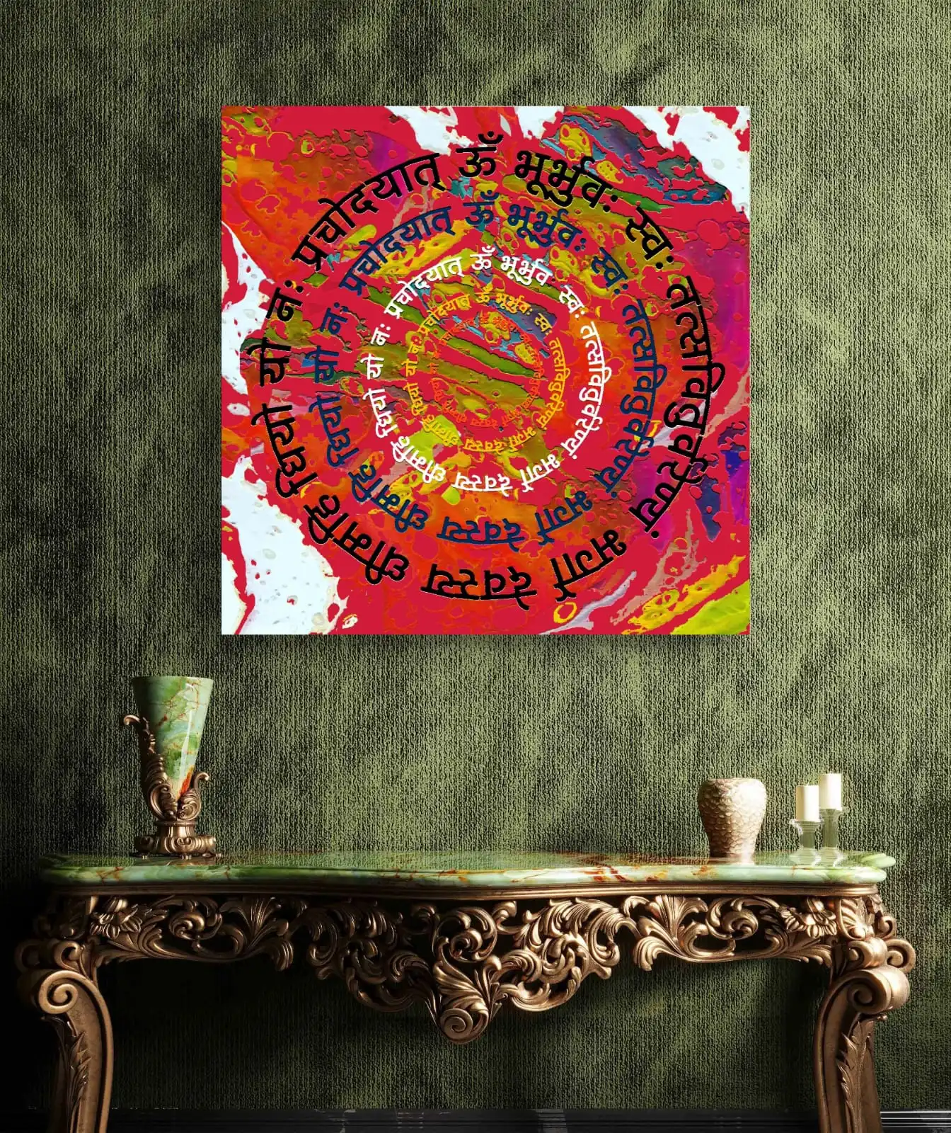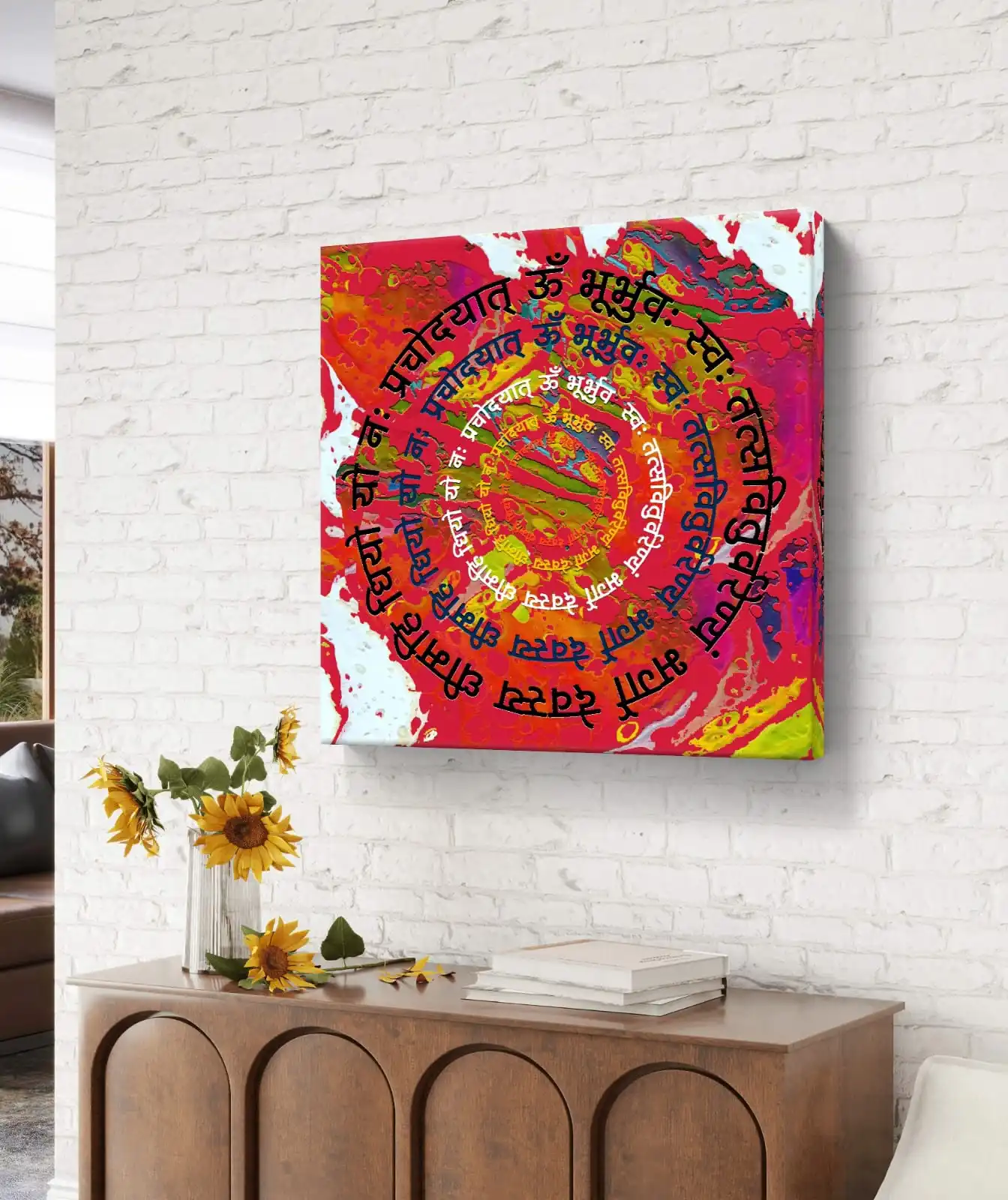 This artwork is a vivid and modern take on the sacred mantra. It is a fine art print made from the original acrylic painting. The colors are bright and give a warm and peaceful feel. This Gayatri Mantra wall art looks great in a home or office. It can also bring calm to a meditation space.