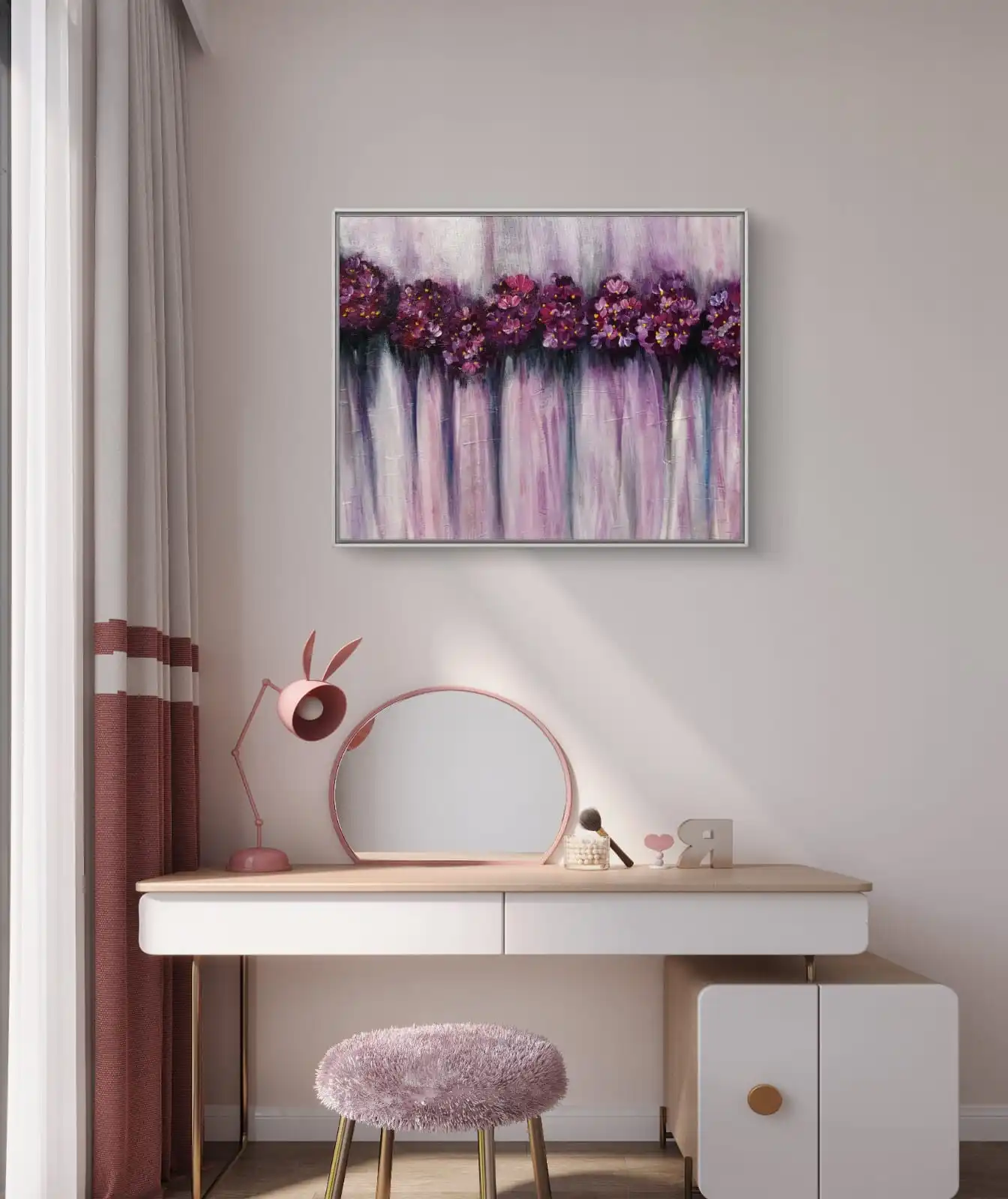 Geranium Floral Embrace Painting fits many spaces. It looks lovely on a bedroom wall, living room wall, or hallway wall. The soft flowers add charm and warmth to home décor.