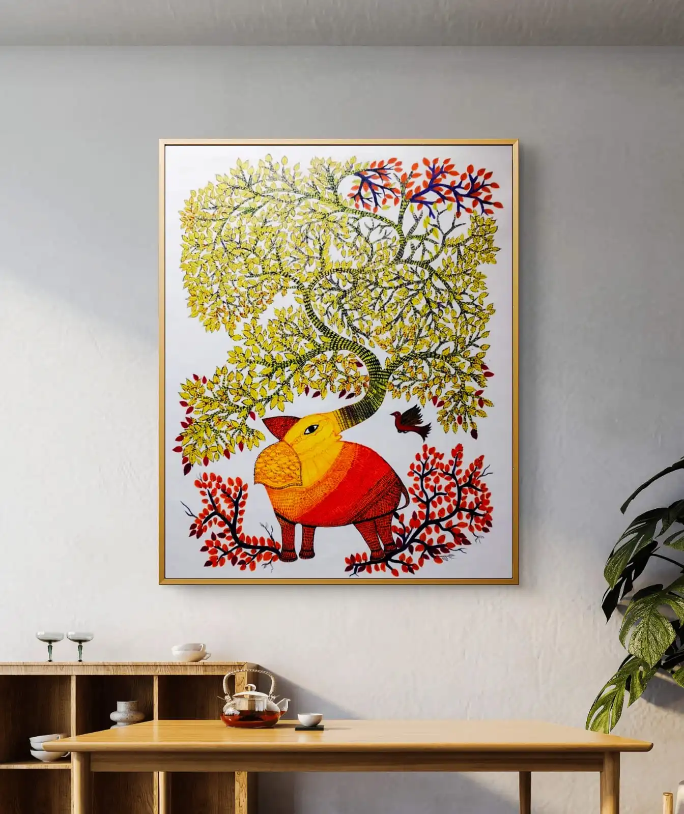 This Gond Elephant Tree Guardian Painting brings color and cultural charm to any space. It looks beautiful in living rooms, offices, or art collections that celebrate Indian folk art.