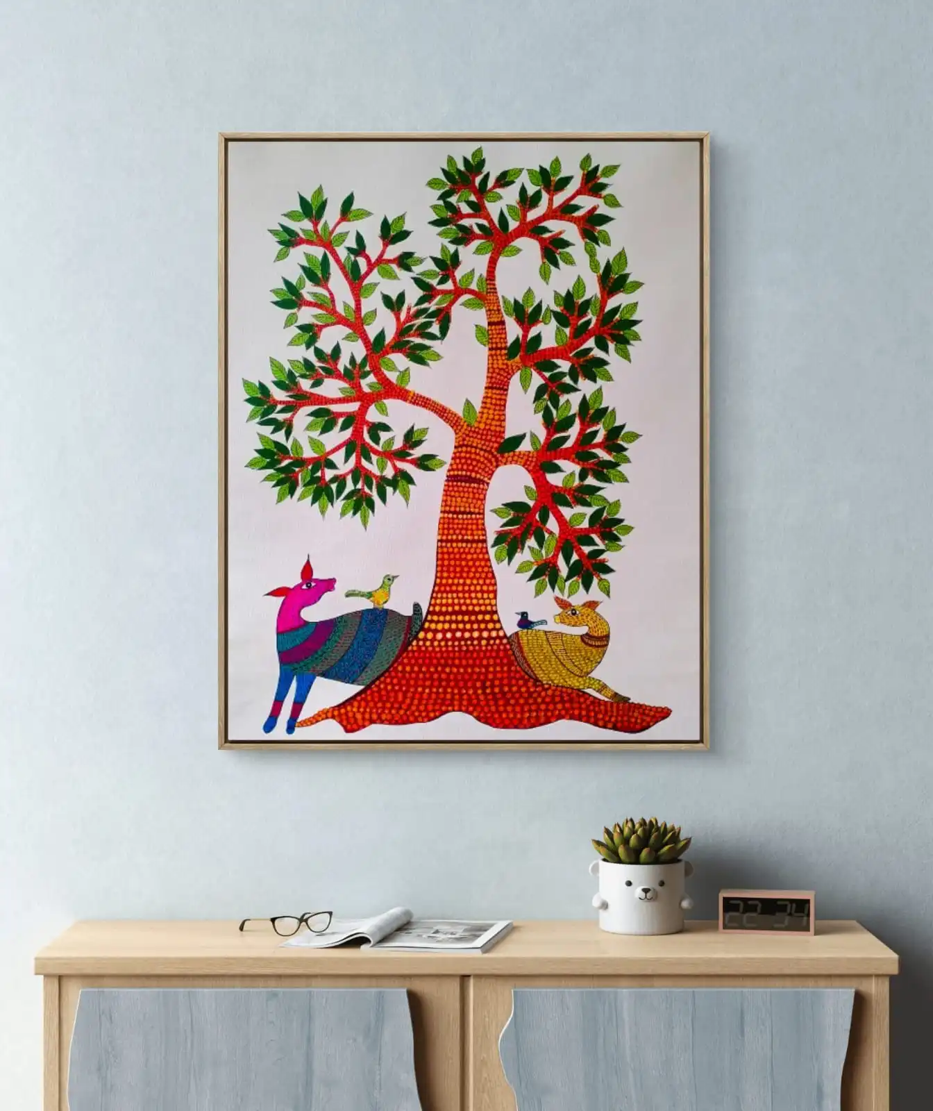 This Gond Wild Companions Painting celebrates animals and nature. It adds color and warmth to any space. It looks beautiful in living rooms and offices. It also suits collections of Indian folk art.