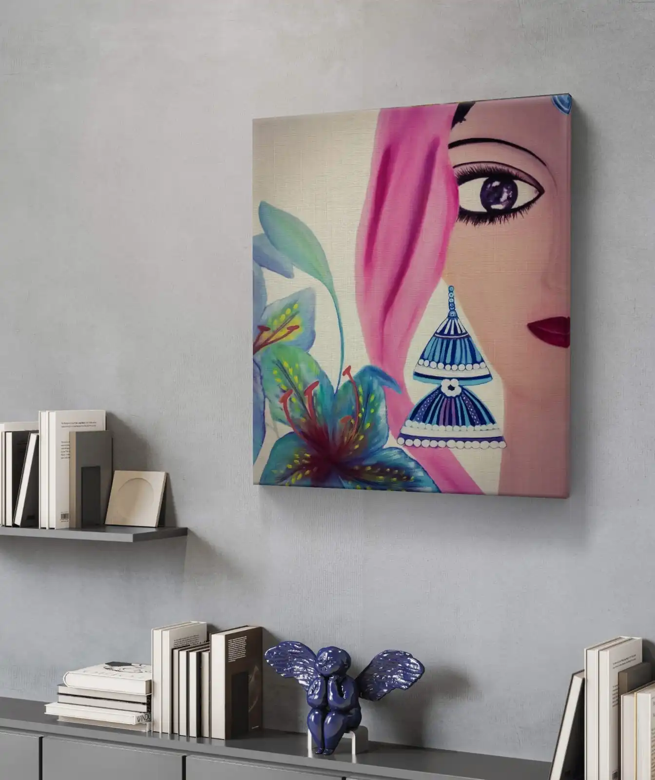 Half Glance of Elegance captures beauty, strength, and grace through color and expression. This original acrylic painting features a woman’s half face framed by soft pink fabric and vivid blue flowers. The detailed eye and gentle tones create a balance of mystery and calm.