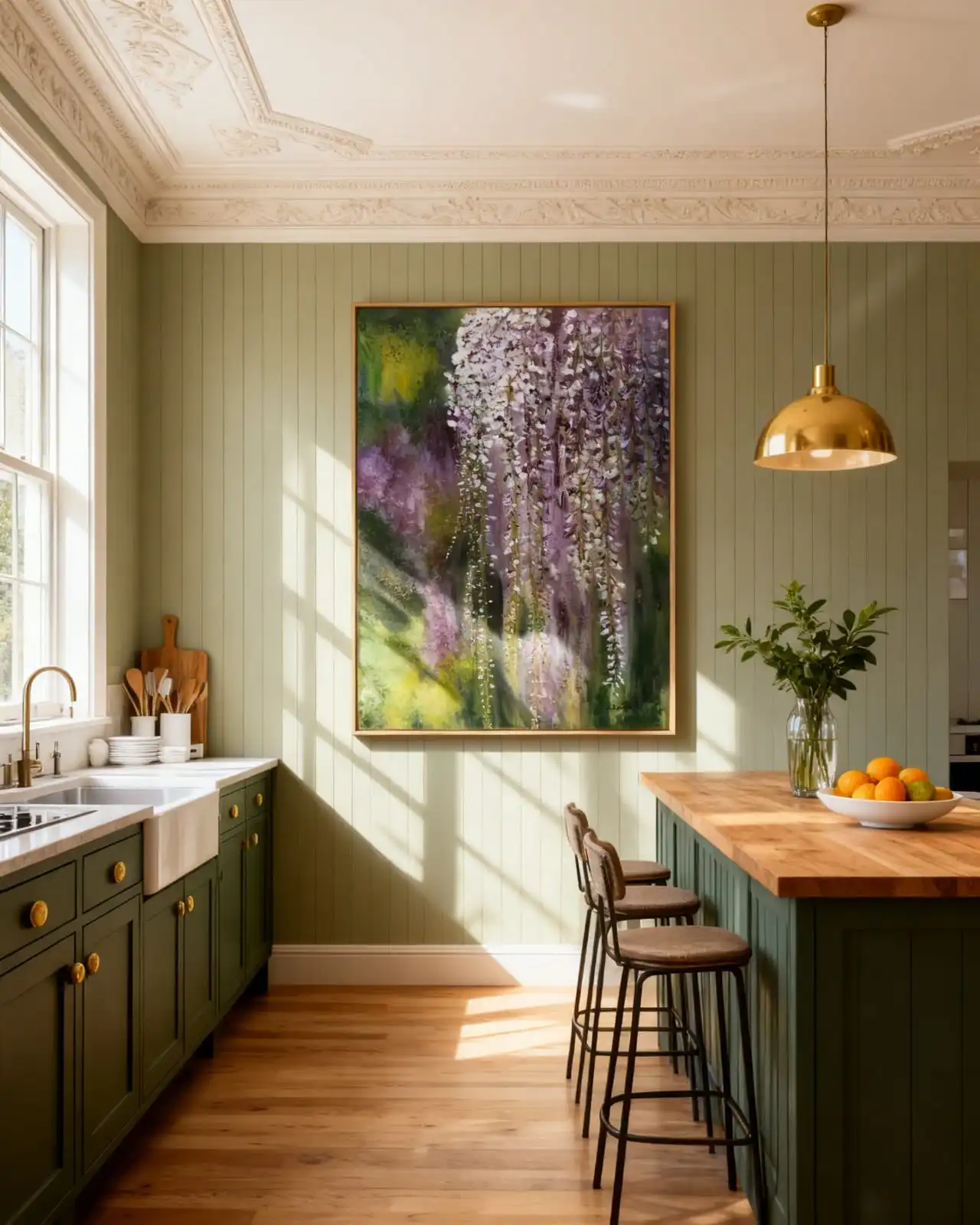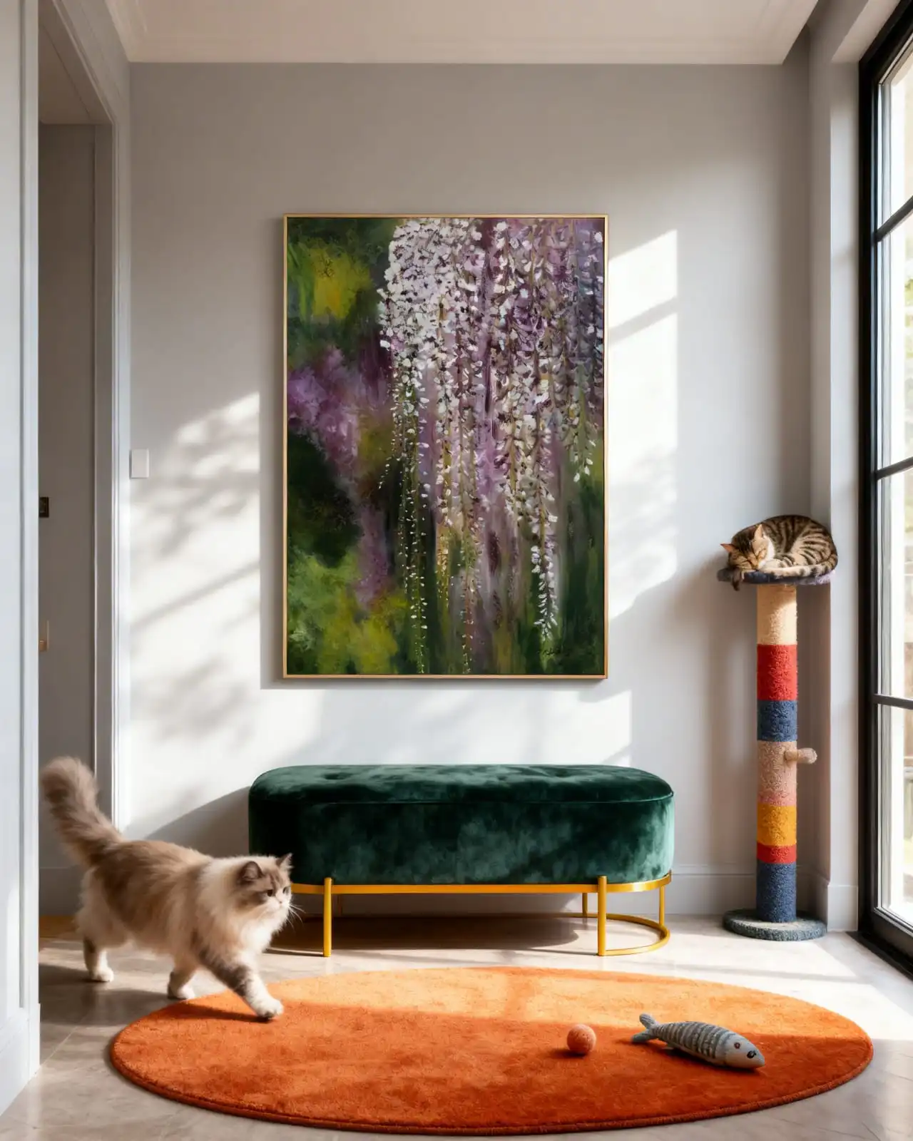 This Hanging Wisteria Acrylic Painting is a handmade acrylic artwork on canvas. Soft brushstrokes add light texture and movement. The artwork brings the beauty of spring flowers into your space.