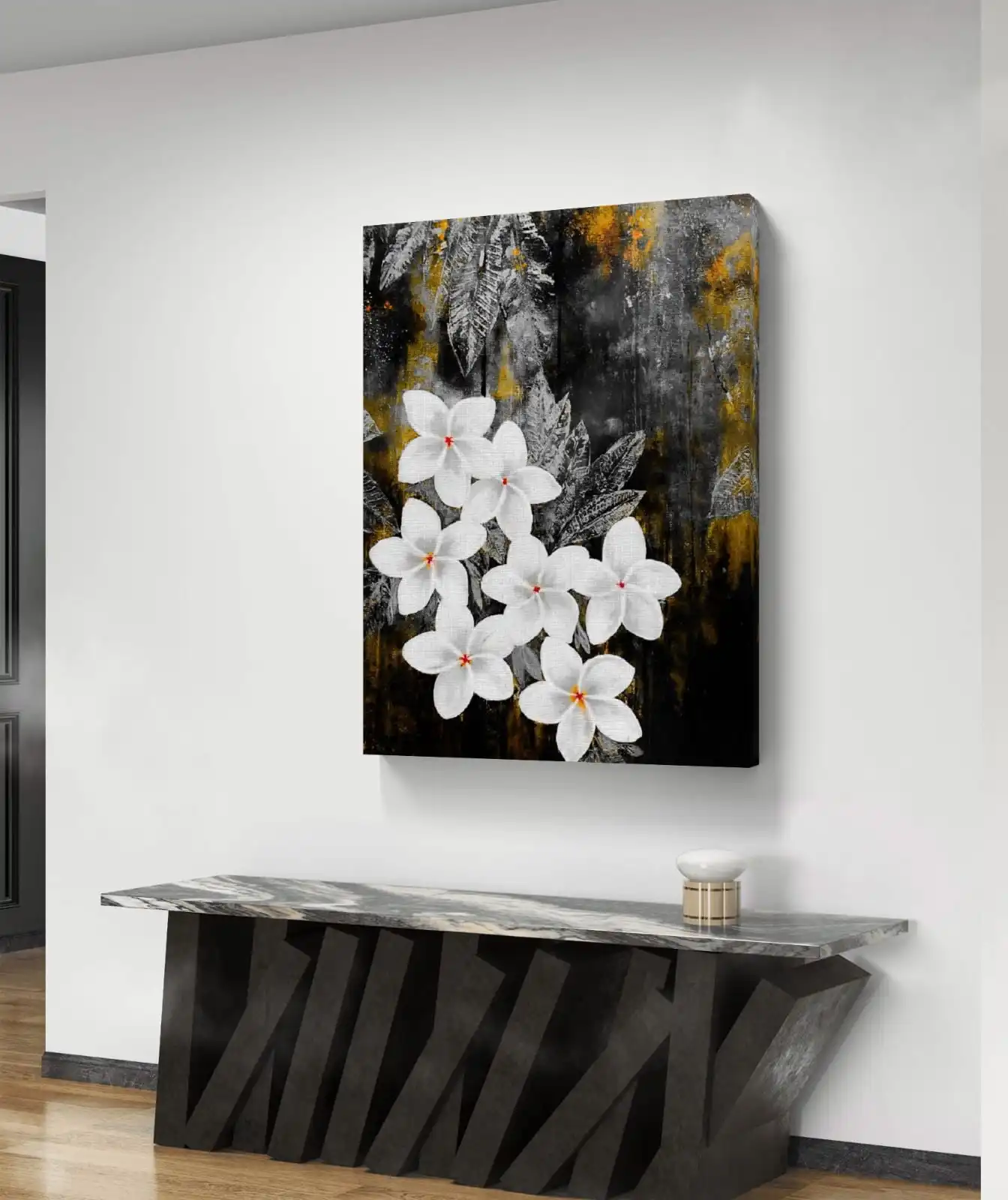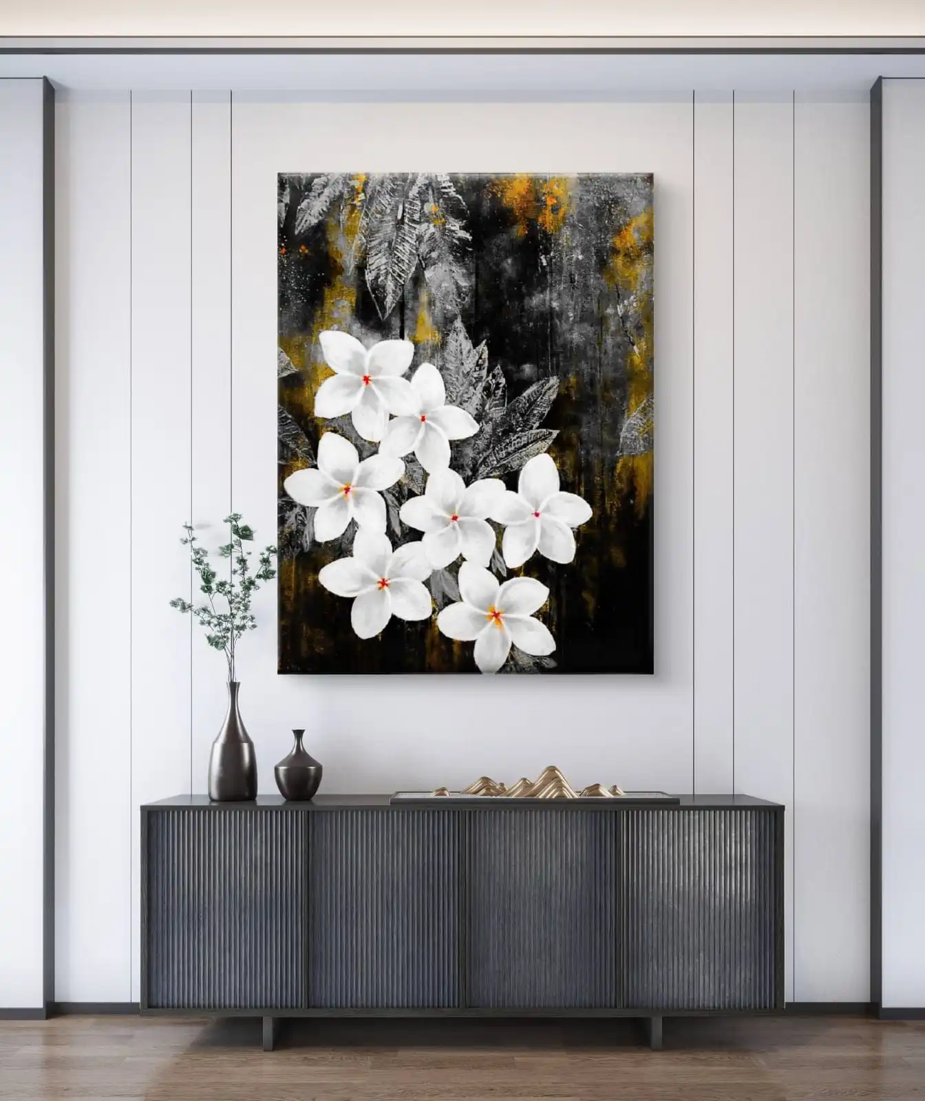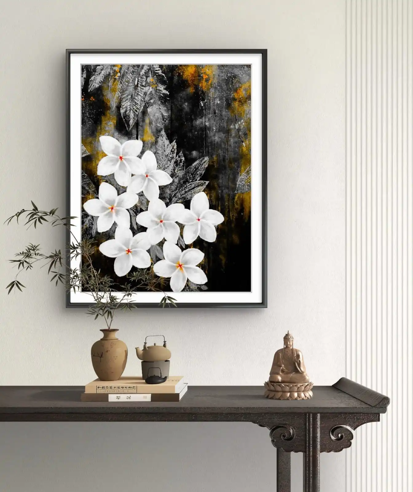 Bring calm and beauty to any room with Moonlit Plumeria Acrylic Painting. This artwork shows a soft plumeria flower bunch on a gray and black background. It is painted on high-quality acrylic canvas for long-lasting color. You can choose framed, unframed, or gallery wrap options to match your space. Each piece is signed by the artist, giving it a personal touch. Moonlit Plumeria Acrylic Painting makes a lovely gift for friends, family, or art lovers. It works well in living rooms, bedrooms, offices, or creative spaces. This elegant wall art adds peace, charm, and modern style to any interior. Its timeless design fits both contemporary and classic décor.