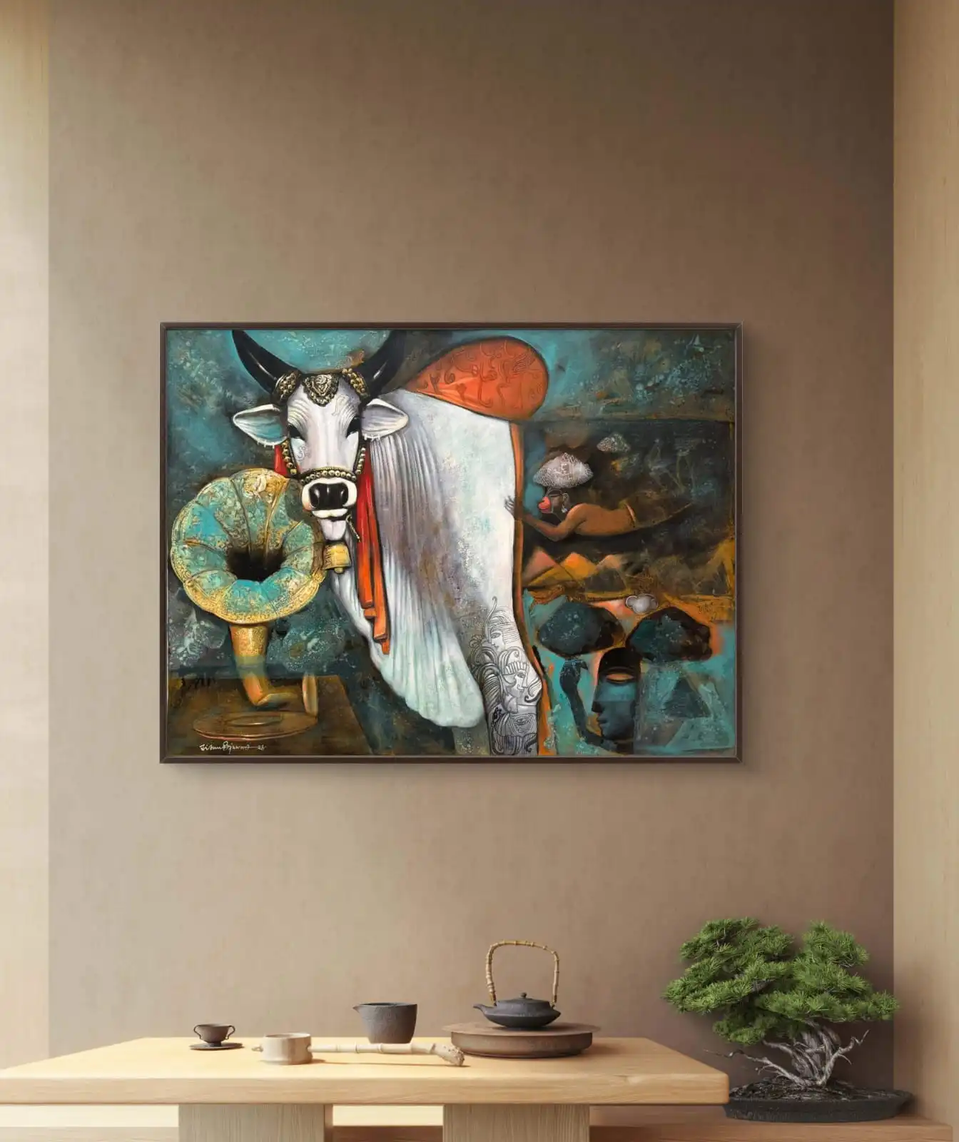 The painting has a soft and thoughtful mood. Its colors and forms create a sense of depth and reflection. It brings a calm and personal touch to your space.