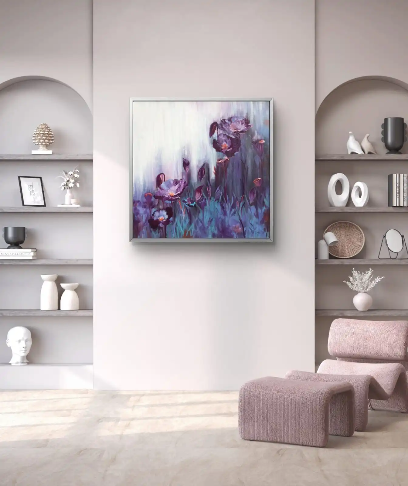 Purple Poppy Garden Artwork brings a fresh garden mood to living rooms, bedrooms, and studio spaces. The artwork size is 26 × 26 inches. It is acrylic on canvas, framed and ready to hang.