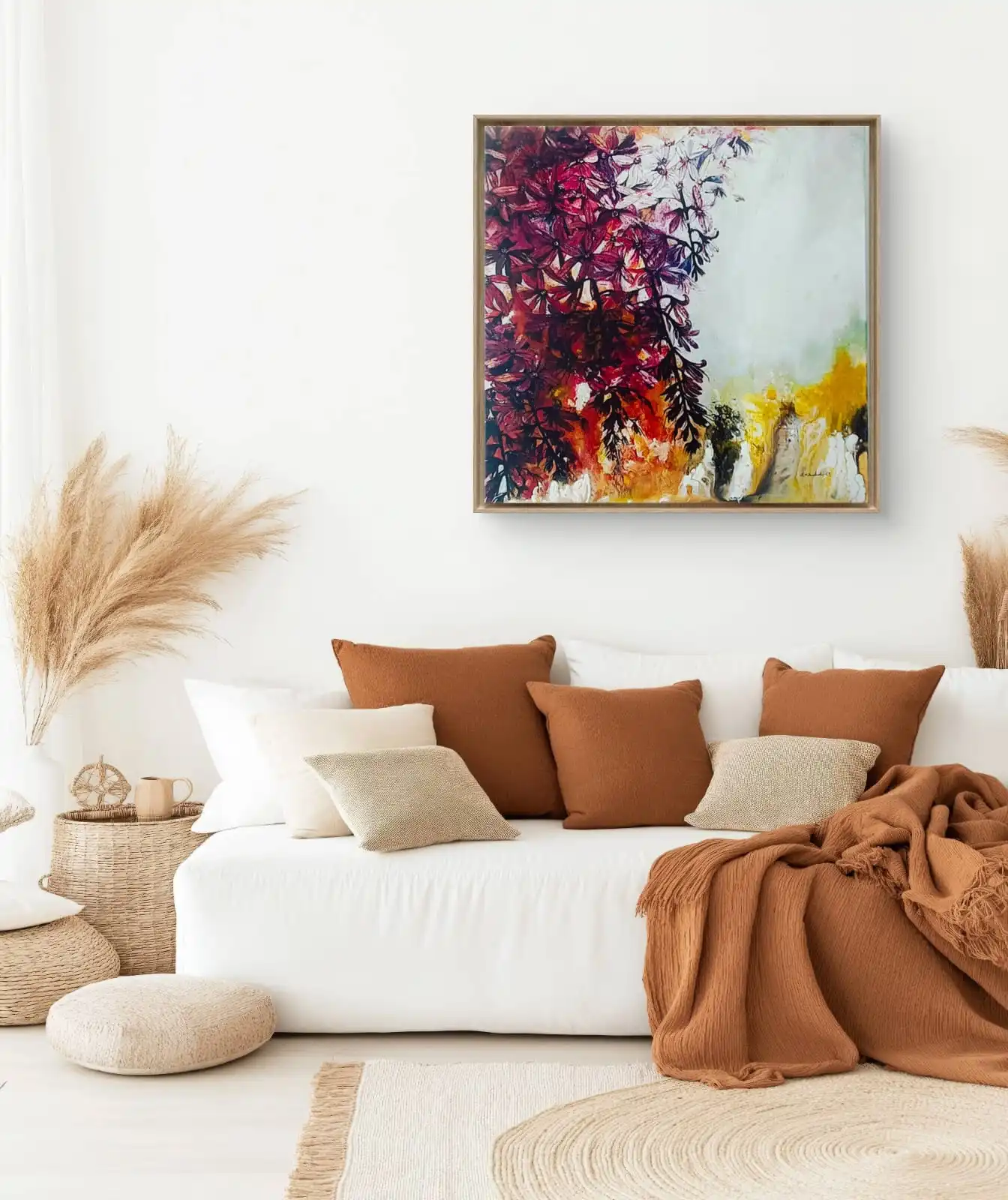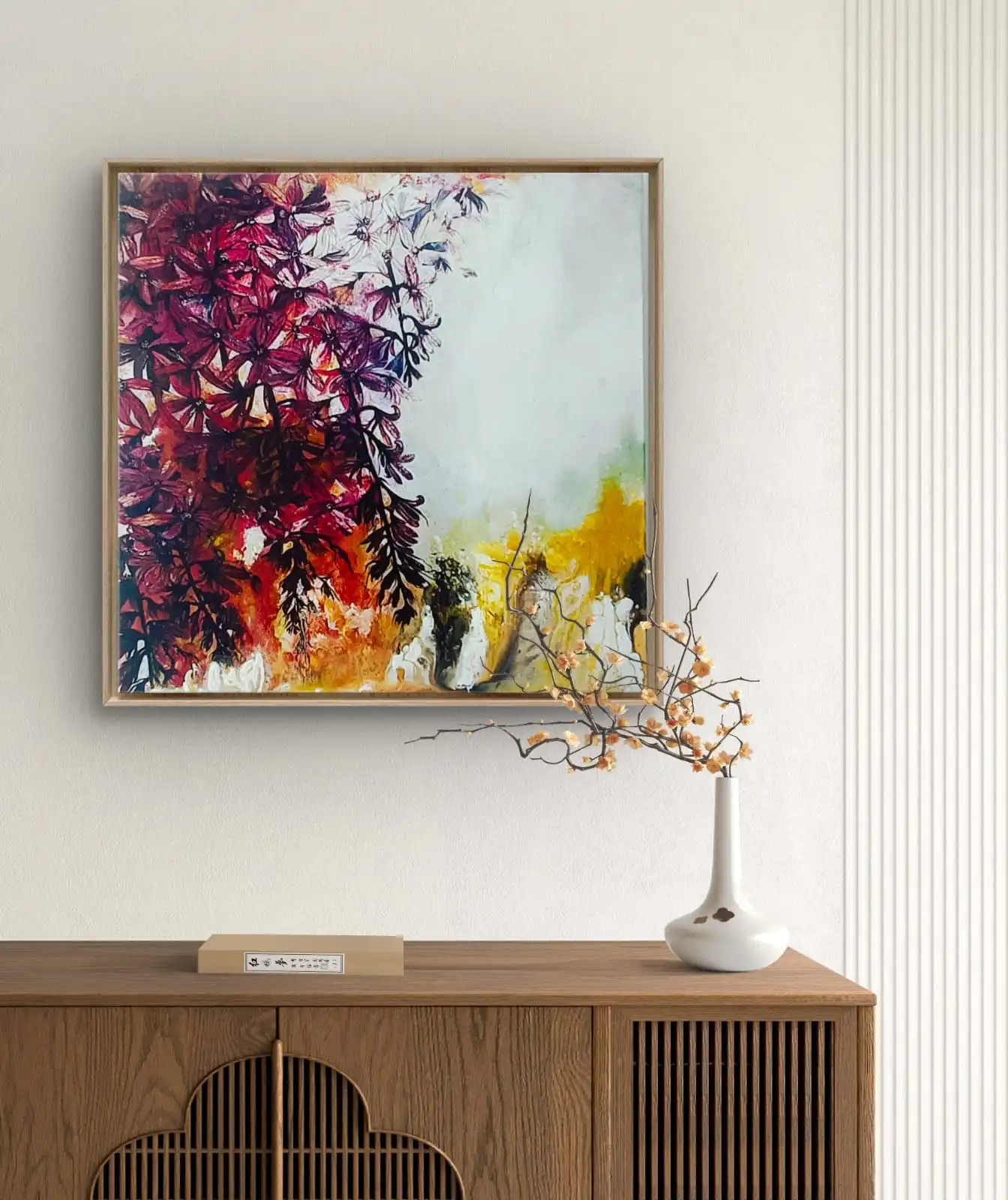 Queens Wreath Floral Painting brings a fresh garden feel to living rooms, studios, and office walls. The artwork size is 24 × 24 inches and the canvas is stretched on a pine wood gallery frame, ready to hang.