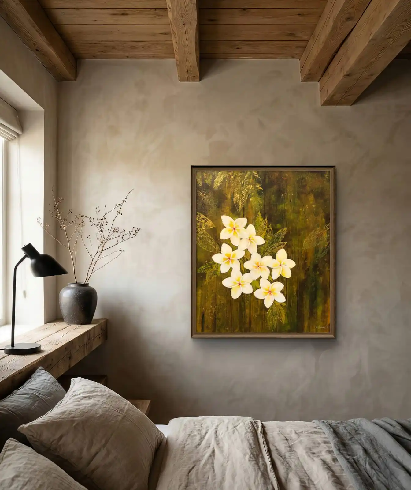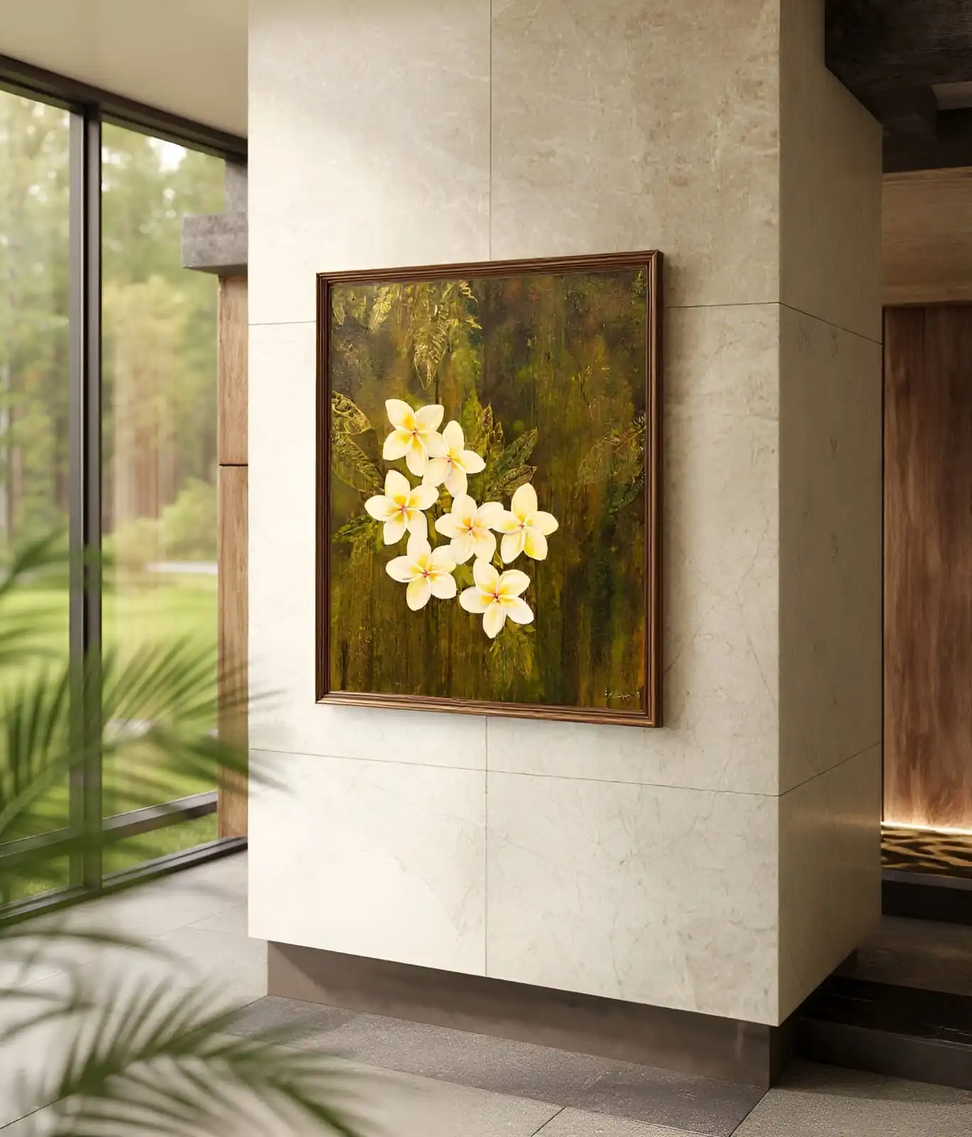 This Sacred White Plumeria Blooms artwork is a handmade acrylic painting on canvas. Expressive brushstrokes give texture and life to the flowers. The artwork celebrates the natural beauty of tropical blooms and garden scenes.