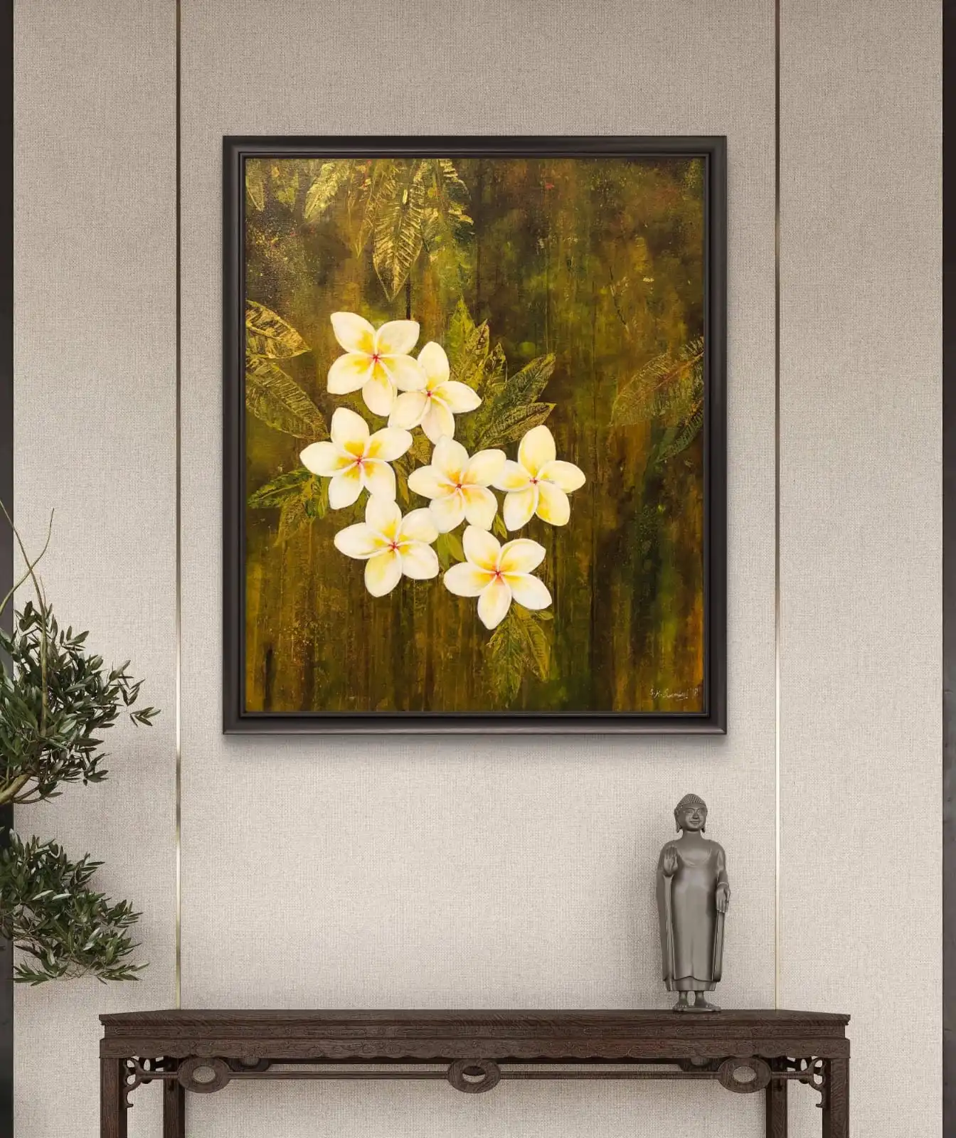 Sacred White Plumeria Blooms is an original floral artwork by artist Sabiha Hasan Sumbul. The painting shows soft white plumeria flowers blooming among green leaves. Warm brown and golden tones in the background add richness to the scene.