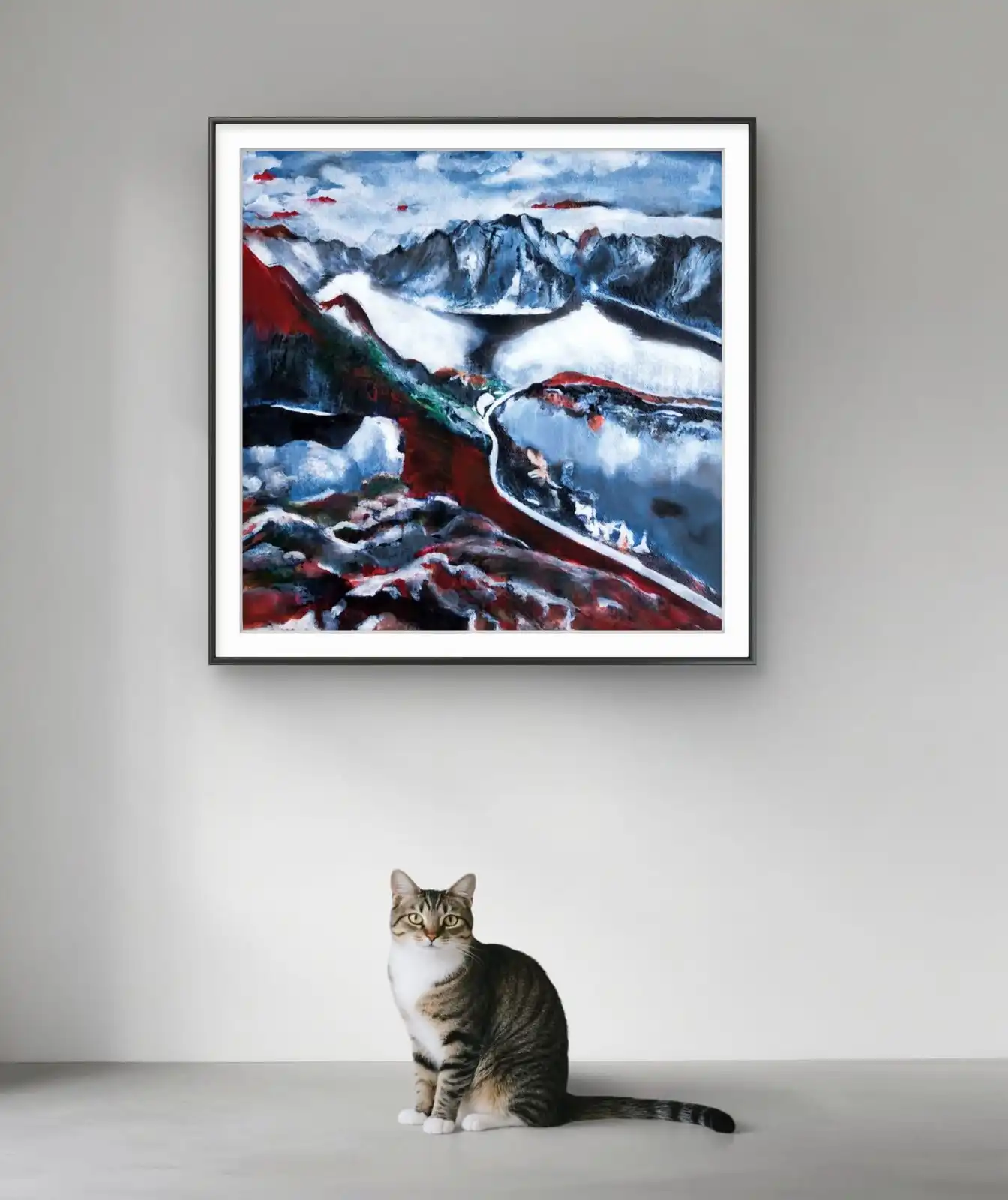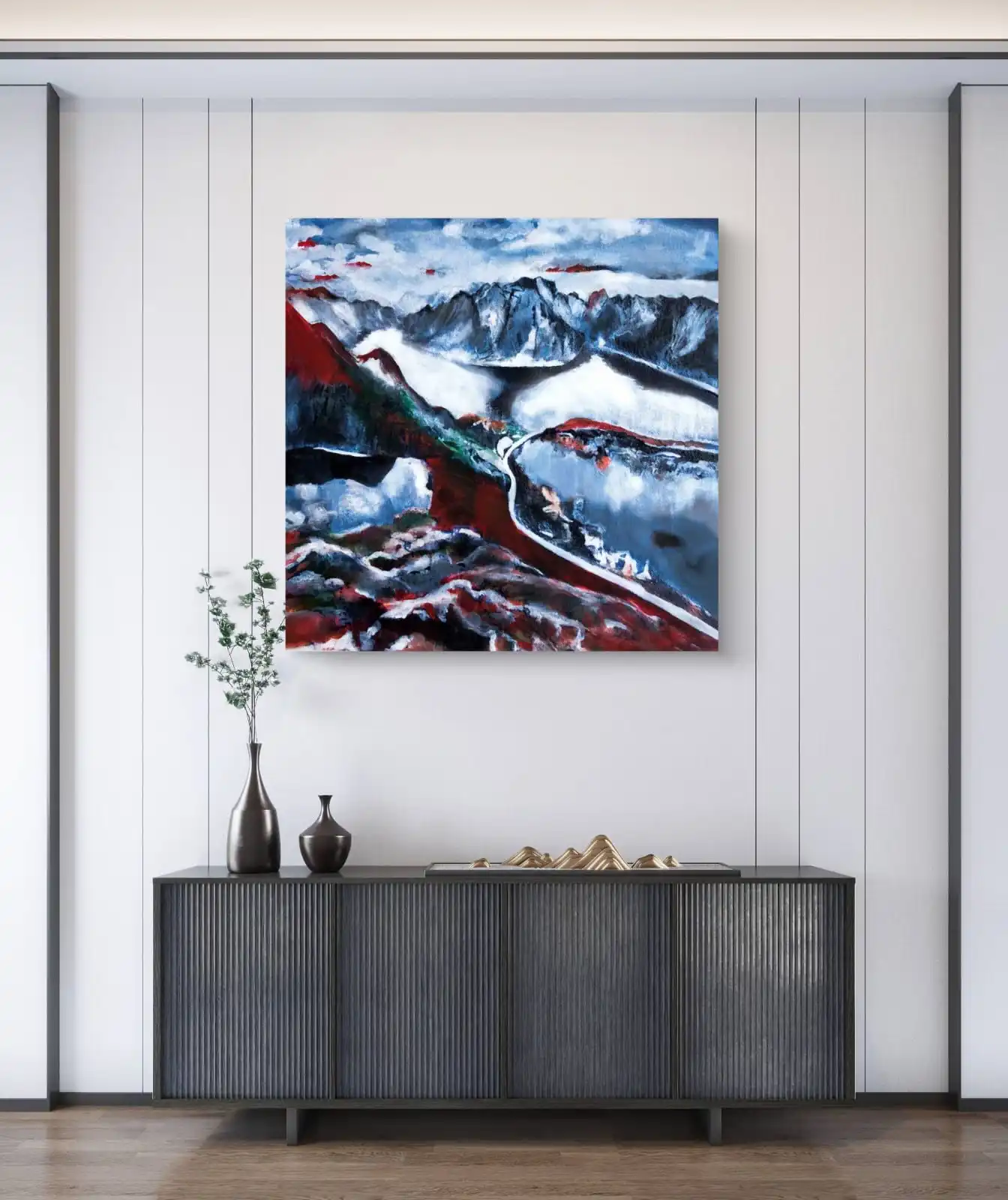 Snow Mountain Ridge is a dramatic acrylic landscape with snowy mountains, red rocky paths, and strong textures. Available as a premium cotton canvas print in multiple framing styles.