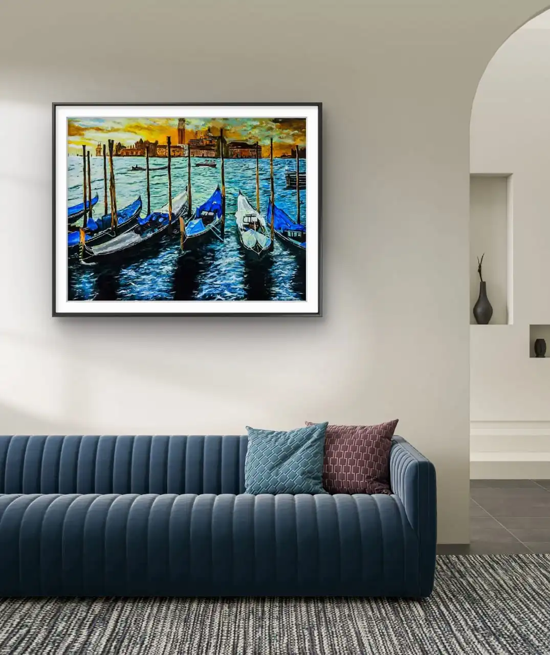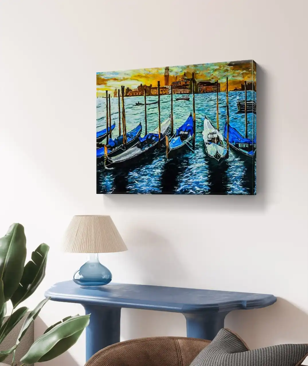 Venice Acrylic Painting brings the charm of the city into your home with warm tones and calm details. The artwork shows peaceful canals, soft reflections, and classic Venetian buildings. Each part of the scene feels gentle and soothing, which helps create a relaxing atmosphere in any room. It adds depth to your space and makes the wall look lively yet balanced. You can choose a classical frame, a gallery frame, or an unframed style to match your decor.