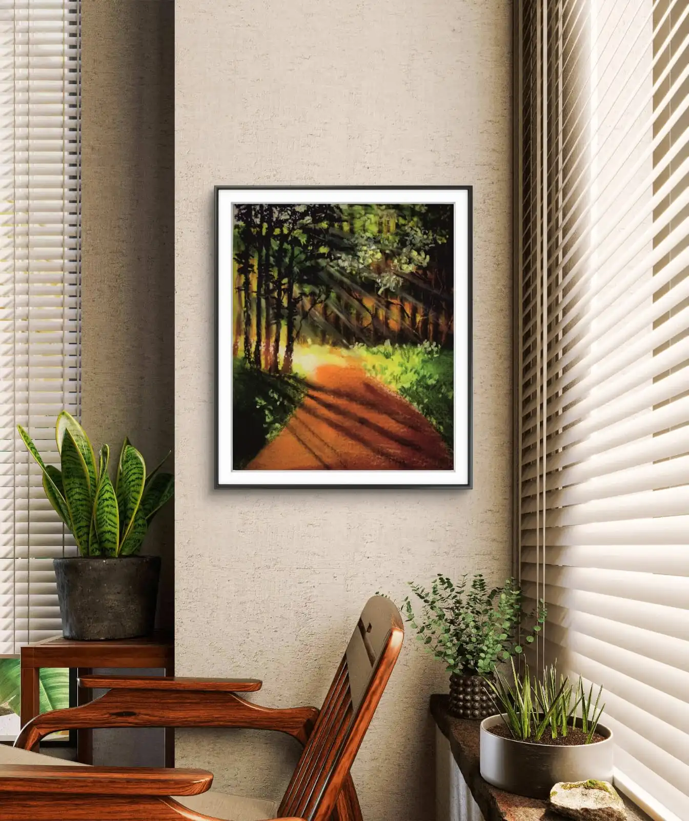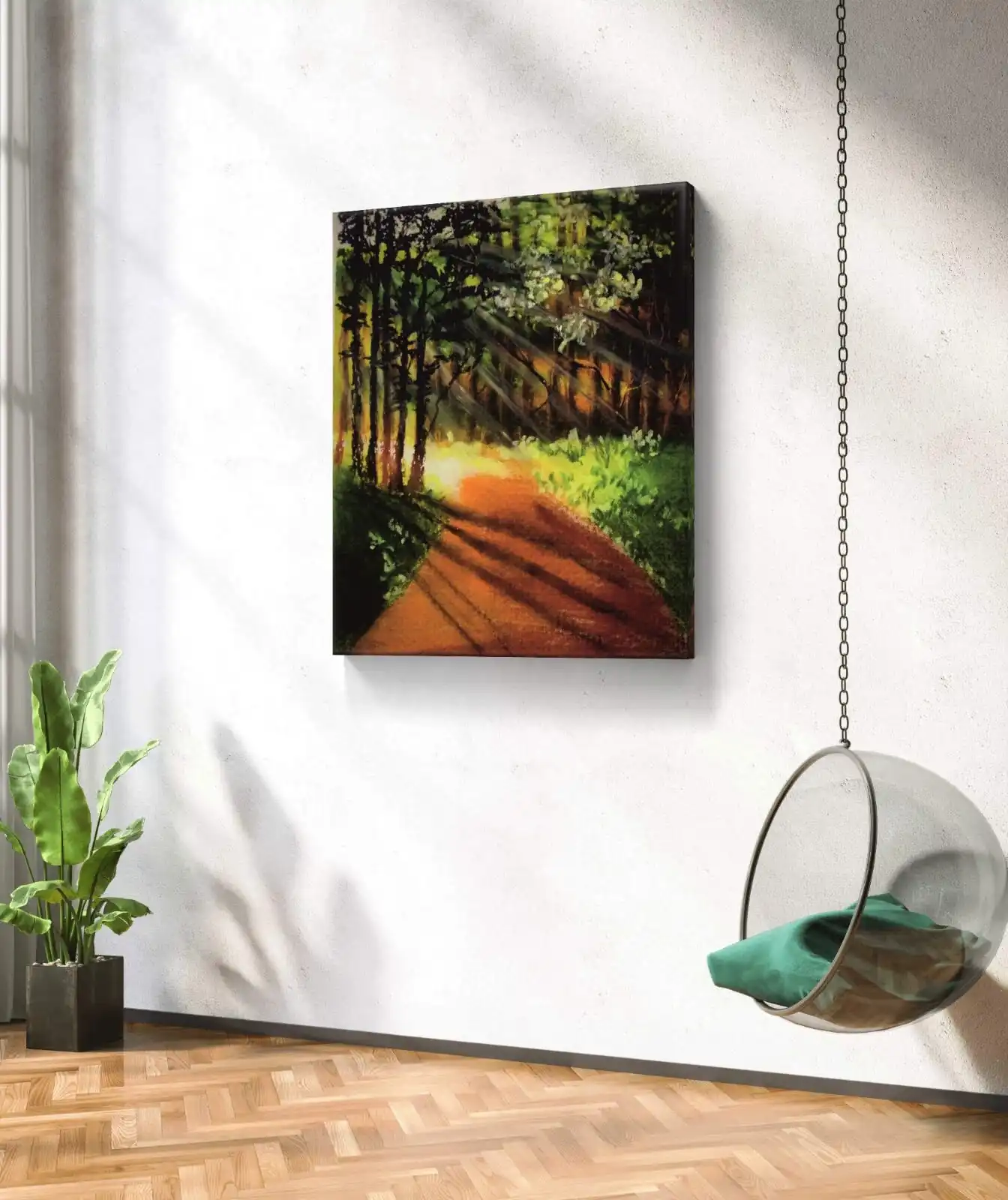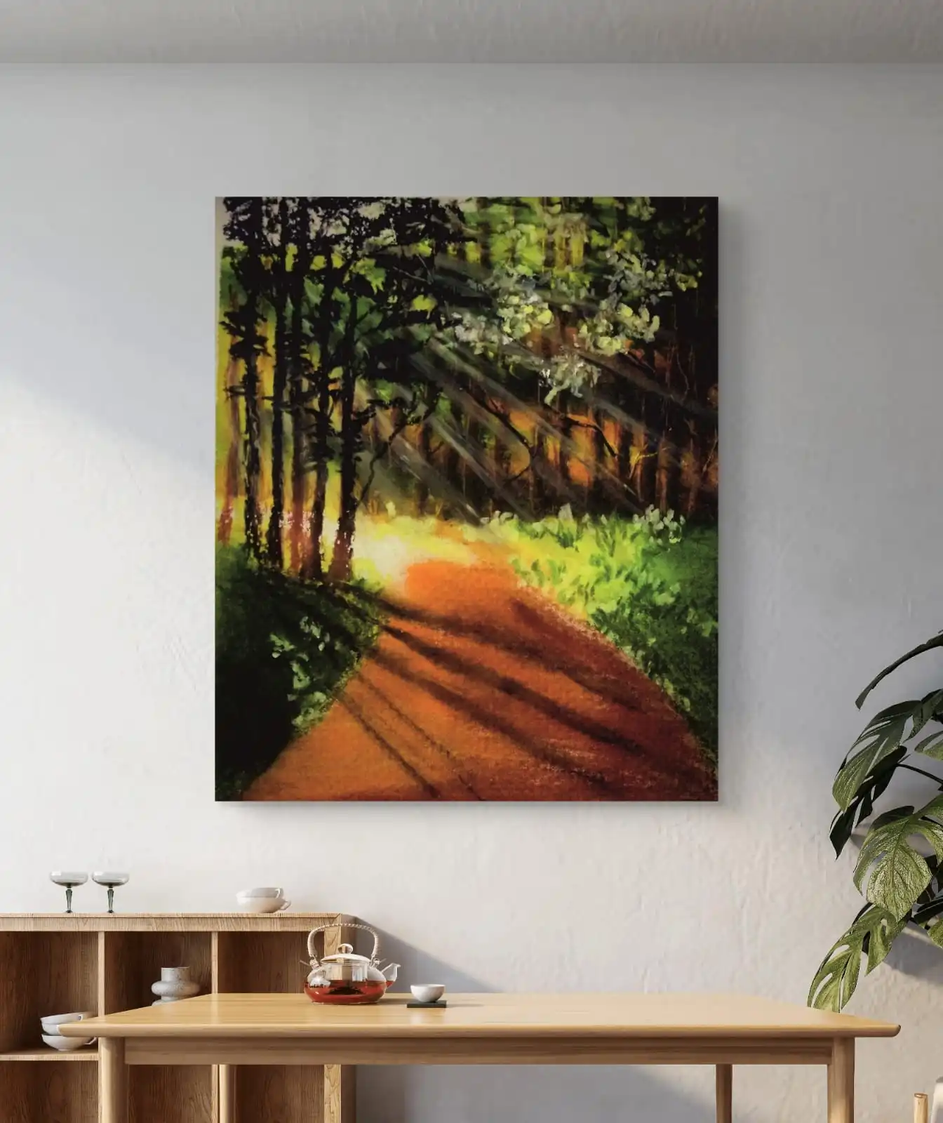 We print Walk in Forest on premium cotton canvas for long-lasting quality. You can choose a classical frame, a gallery frame, or an unframed style. Each option suits modern and traditional interiors. This artwork works well in living rooms, bedrooms, offices, and farmhouse-style décor. It adds comfort and freshness to your home. This painting also makes a thoughtful gift for nature lovers.